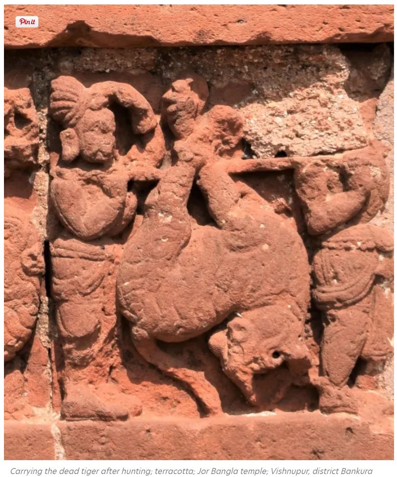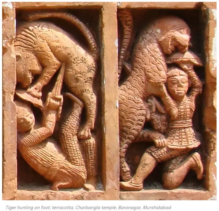 Tiger hunting on foot, using daggers; terracotta; Charbangla temple in Baronagar, district Murshidabad, West Bengal, India [Source: Tiger Hunting in the Decorations of Temples in West Bengal]