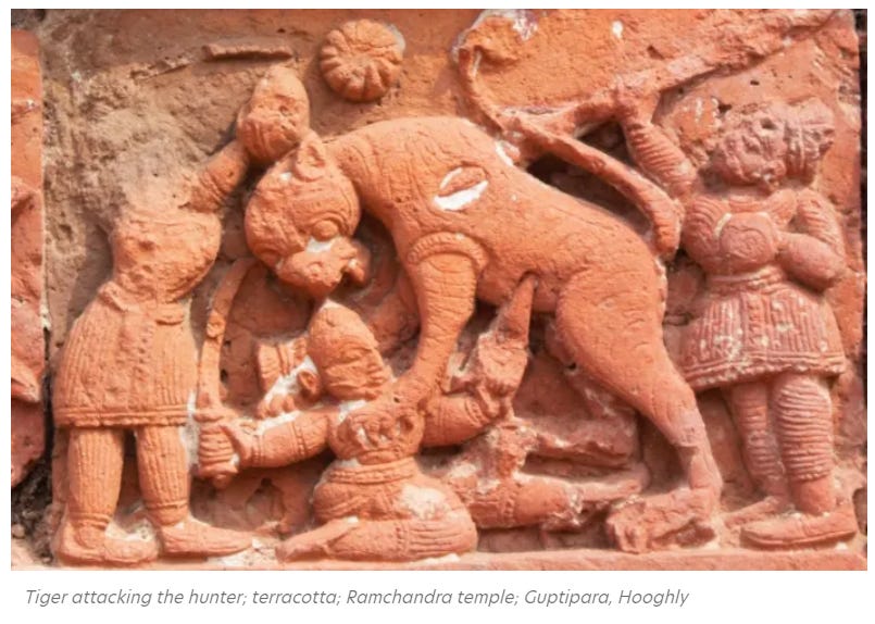 Tiger attacking the hunter; terracotta; Ramchandra temple in Guptipara, Hooghly district, West Bengal, India [Source: Hunters and Hunting in the Decorations of Temples of West Bengal]