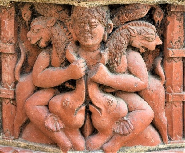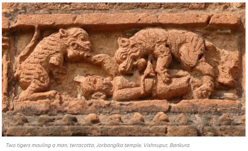 Two tigers mauling a man; terracotta; Jorbangla temple in Bishnupur, Bankura district, West Bengal, India [Source: Hunters and Hunting in the Decorations of Temples of West Bengal]
