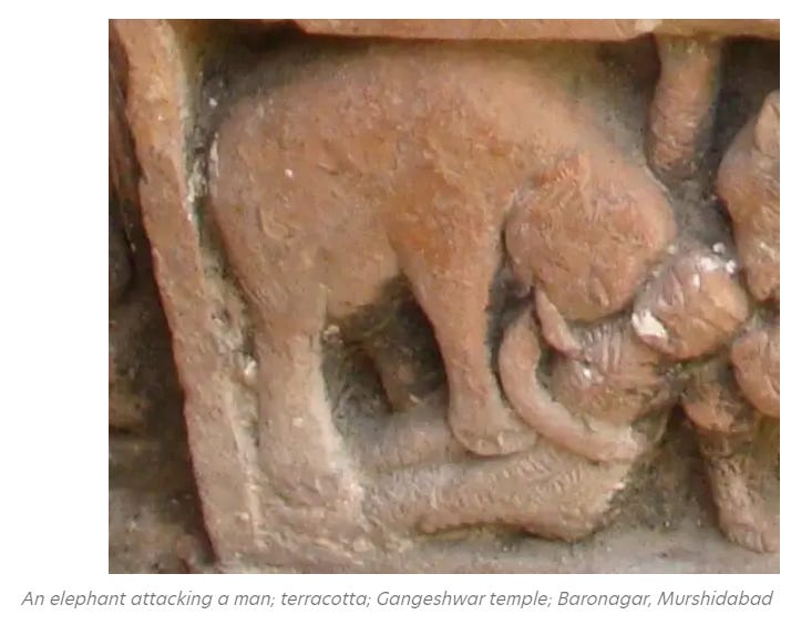 Terracotta panel showing a man being attacked by an elephant; Gangeshwar temple in Baronagar, Murshidabad district, West Bengal, India [Source: Hunters and Hunting in the Decorations of Temples of West Bengal]