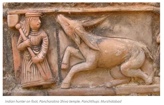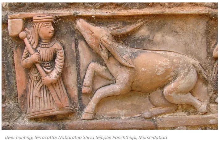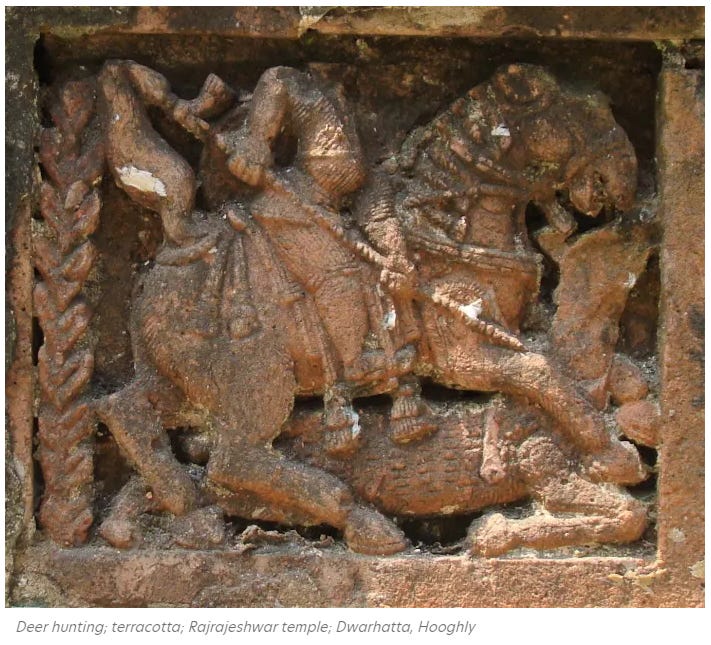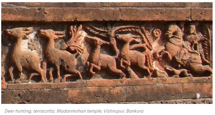 Deer hunting; terracotta; Madanmohan temple in Bishnupur, Bankura, West Bengal, India [Source: Hunters and Hunting in the Decorations of Temples of West Bengal]