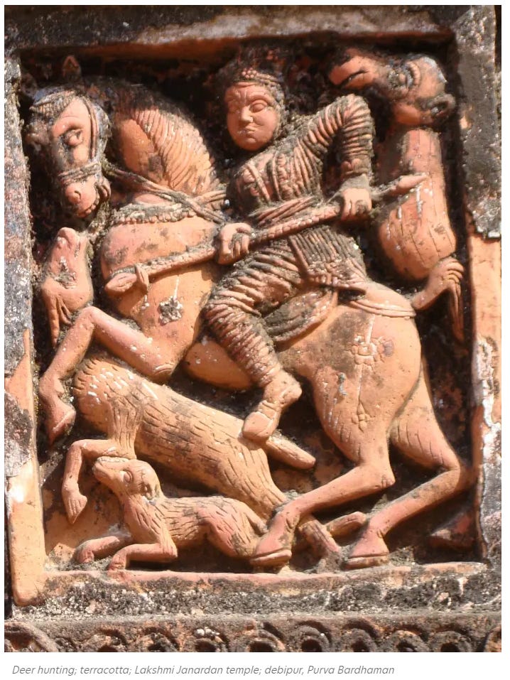 Deer hunting; terracotta; Lakshmi Janardan temple in Debipur, Purva Bardhaman, West Bengal, India [Source: Hunters and Hunting in the Decorations of Temples of West Bengal]