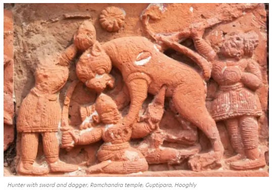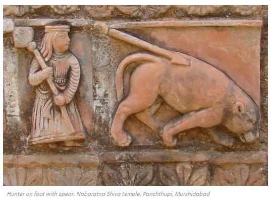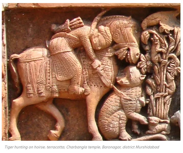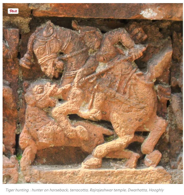 Tiger hunting on horseback, using spear; terracotta; Rajrajeshwar temple in Dwarhatta, Hooghly district, West Bengal, India [Source: https://discover.hubpages.com/art/HUNTERS-AND-HUNTING-IN-THE-DECORATIONS-OF-TEMPLES-OF-WEST-BENGAL]