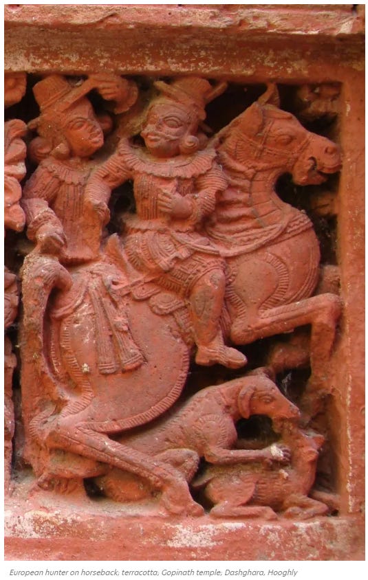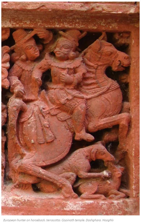 European hunter on horseback; terracotta; Gopinath temple in Dashghara, Hooghly district, West Bengal, India [Source: Hunters and Hunting in the Decorations of Temples of West Bengal]