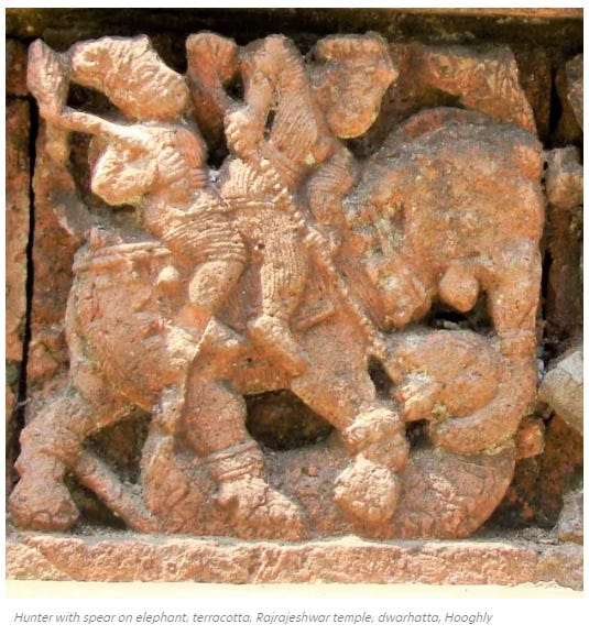 Elephant-mounted Indian hunter; terracotta; Raghunath Shiva temple in Ghurisha, Birbhum district, West Bengal, India [Source: Hunters and Hunting in the Decorations of Temples of West Bengal]