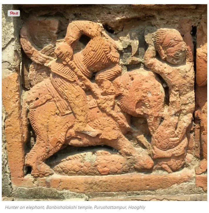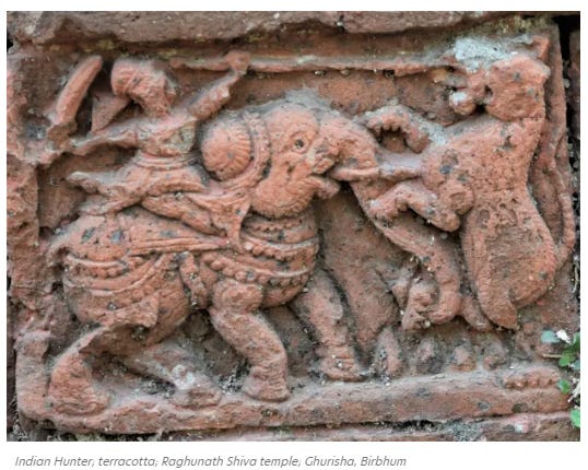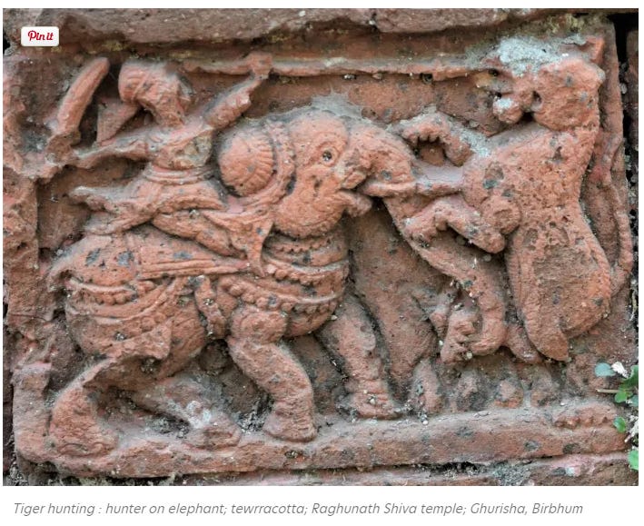 Tiger hunting on elephant; terracotta; Raghunath Shiva temple in Ghurisha, Birbhum district, West Bengal, India [Source: https://discover.hubpages.com/art/HUNTERS-AND-HUNTING-IN-THE-DECORATIONS-OF-TEMPLES-OF-WEST-BENGAL]