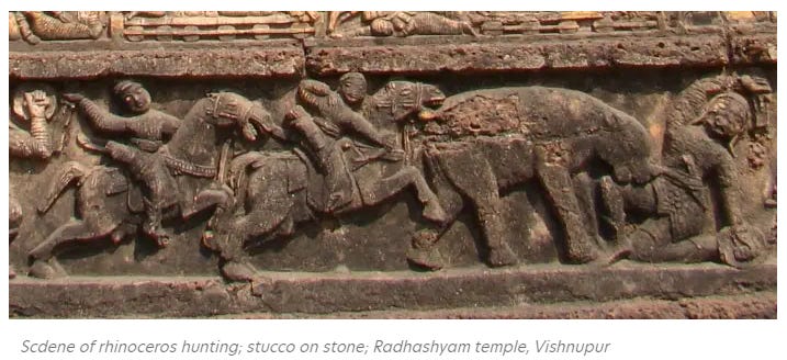Scene of rhinoceros hunting; stucco on stone; Radhashyam temple, Bishnupur, West Bengal, India [Source: Rhinoceros hunting in the decorations of temples of West Bengal]