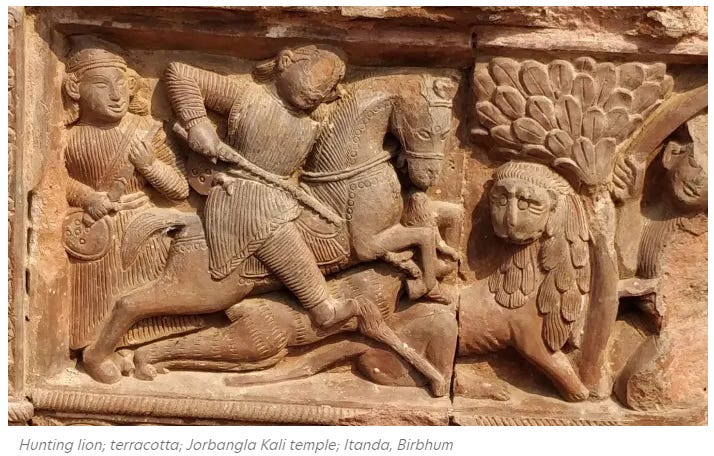 Hunting lion on horseback; terracotta; Jorbangla Kali temple In Itanda, Birbhum, district, West Bengal, India [Source: Hunters and Hunting in the Decorations of Temples of West Bengal]