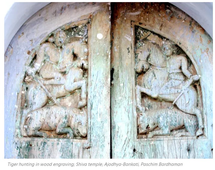 Tiger hunting; wood carving; Shiva temple in Bankati-Ajodhya, Paschim Bardhaman district, West Bengal, India [Source: Tiger Hunting in the Decorations of Temples in West Bengal]
