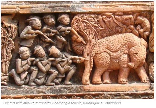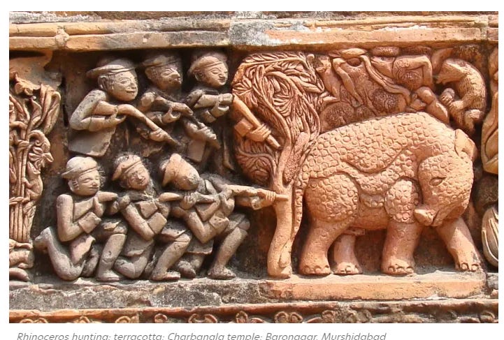 Hunting a one-horned rhinoceros using muskets; terracotta; Charbangla temple in Baronagar, Murshidabad district, West Bengal, India [Source: Hunters and Hunting in the Decorations of Temples of West Bengal]