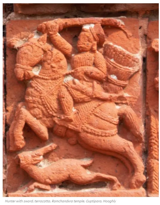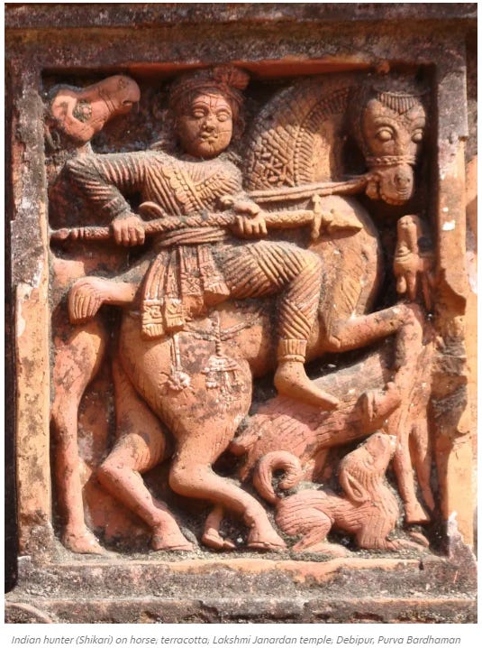 Horse-mounted Indian hunter; terracotta; Lakshmi Janardan temple in Debipur, Purba Bardhaman district, West Bengal, India [Source: Hunters and Hunting in the Decorations of Temples of West Bengal]