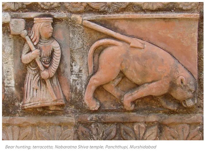 Bear hunting; terracotta; Nabaratna Shiva temple in Panchthupi, Murshidabad, West Bengal, India [Source: Hunters and Hunting in the Decorations of Temples of West Bengal]