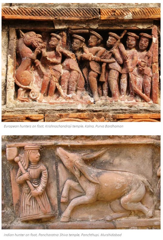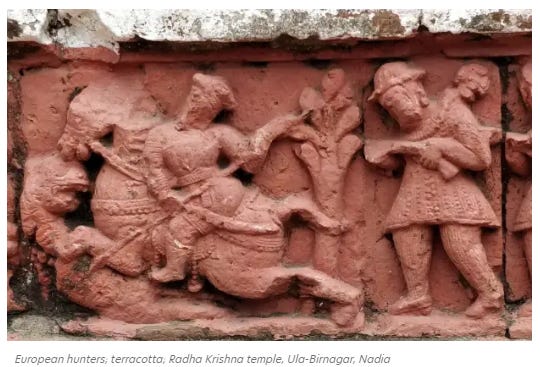 European hunters; terracotta; Radha Krishna temple in Ula-Birnagar, Nadia district, West Bengal, India [Source: Hunters and Hunting in the Decorations of Temples of West Bengal]