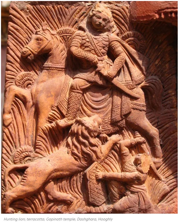 Hunting lion on horseback; terracotta; Gopinath temple in Dashghara, Hooghly, West Bengal, India [Source: Hunters and Hunting in the Decorations of Temples of West Bengal]