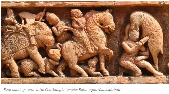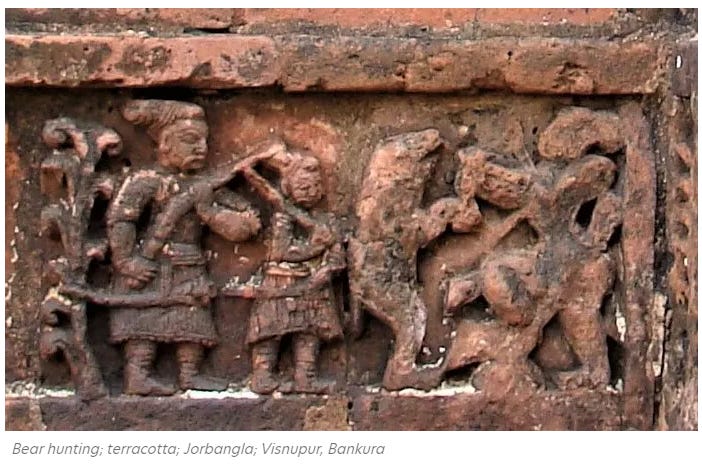 Bear hunting; terracotta; Jorbangla Temple in Bishnupur, Bankura, West Bengal, India [Source: Hunters and Hunting in the Decorations of Temples of West Bengal]