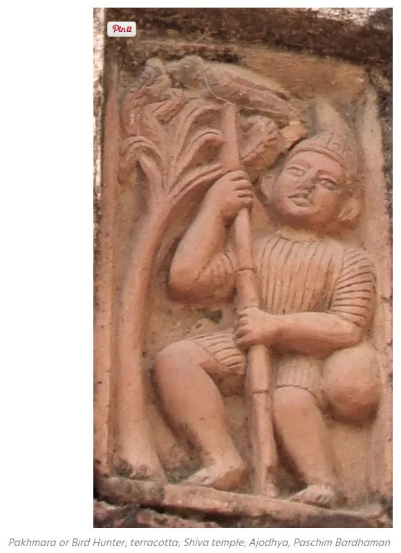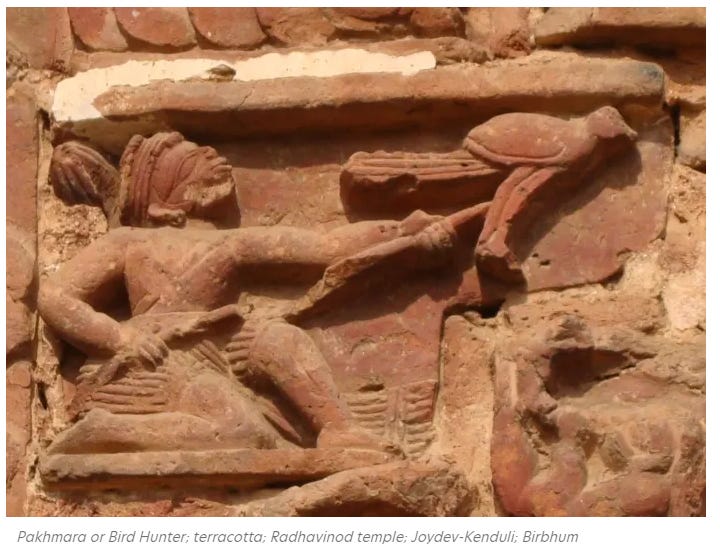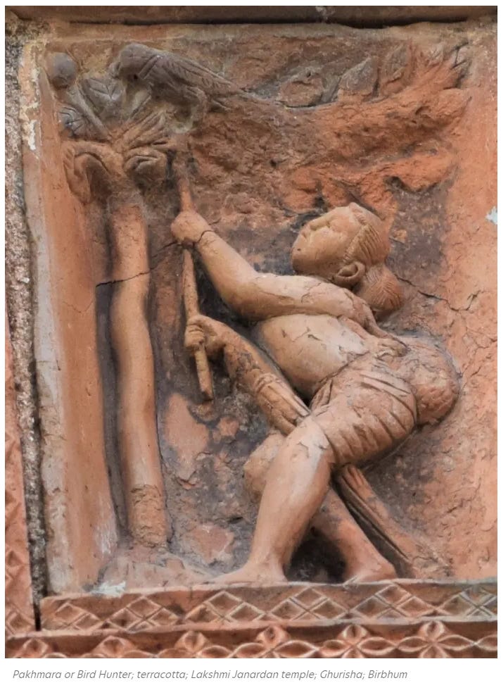 Pakhmara; terracotta; Lakshmi Janardan temple in Ghurisha, Birbhum, West Bengal, India [Source: Pakhmara, the tribal bird hunters of Bengal and their presence in decorations of temples in West Bengal