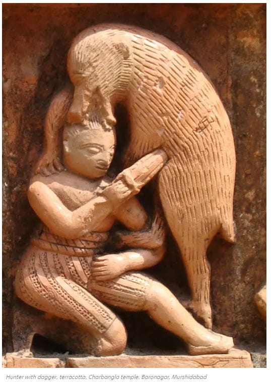 Hunting a bear using dagger (probably a push-dagger called Kaṭār); terracotta; Charbangla temple in Baronagar, Murshidabad, West Bengal, India [Source: Hunters and Hunting in the Decorations of Temples of West Bengal]