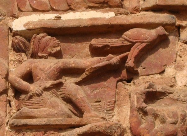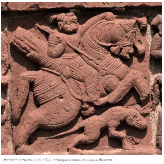 Hunter on horseback; terracotta bas-relief; Jorbangla temple in Bishnupur, Bankura district, West Bengal, India [Source: Hunters and Hunting in the Decorations of Temples of West Bengal]