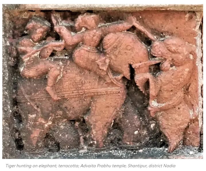 Tiger hunting on elephant; terracotta; Advaita Prabhu temple in Shantipur, Nadia district, West Bengal, India [Source: Tiger Hunting in the Decorations of Temples in West Bengal]