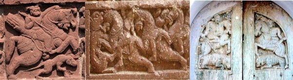 → L2R: Examples of Hunting scenes by medium [Source: Hunters and Hunting in the Decorations of Temples of West Bengal]