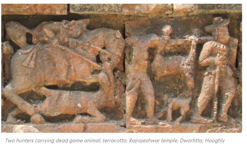 Carrying dead deer back after hunting; terracotta; Rajrajeshwar temple in Dwarhatta, Hooghly, West Bengal, India [Source: Hunters and Hunting in the Decorations of Temples of West Bengal]