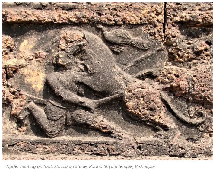 Tiger hunting on foot; stucco on stone; Radha Shyam temple in Bishnupur, Bankura district, West Bengal, India [Source: Tiger Hunting in the Decorations of Temples in West Bengal]