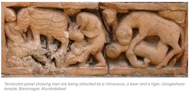 Terracotta panel showing men are being attacked by a rhinoceros, a bear and a tiger; Gangeshwar temple in Baronagar, Murshidabad district, West Bengal, India [Source: Hunters and Hunting in the Decorations of Temples of West Bengal]
