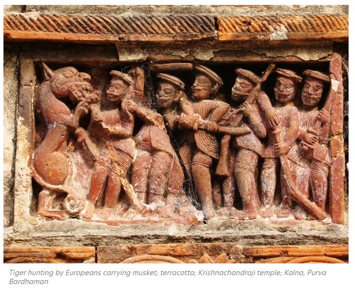 Tiger hunting by European hunters carrying muskets; Krishnachandraji temple in Kalna, Purba Bardhaman district, West Bengal, India [Source: Tiger Hunting in the Decorations of Temples in West Bengal]