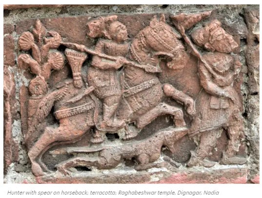 Hunter with spear on horseback; terracotta; Raghabeshwar temple in Dignagar, Nadia district, West Bengal India [Source: Hunters and Hunting in the Decorations of Temples of West Bengal]