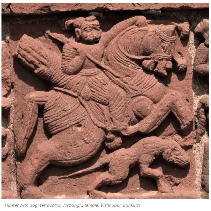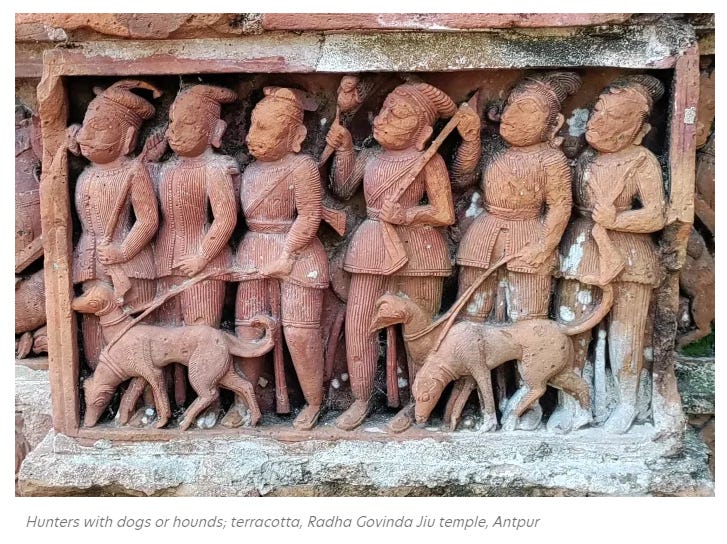 Hunters with hunting dogs; terracotta; Radha Govinda Jiu temple, Antpur, Hooghly district, West Bengal, India [Source: https://discover.hubpages.com/travel/Radha-Govinda-Jiu-Temple-of-Antpur-A-temple-which-aims-at-the-union-of-all-religions]