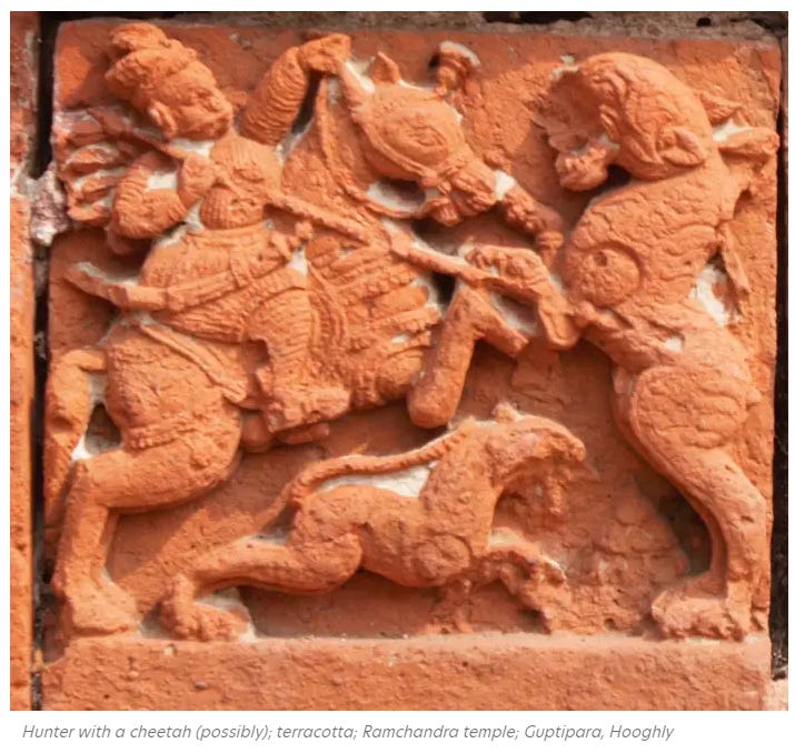 A hunter with an assistant animal with longer tail and broader face than that of dogs — this is presumed to be a cheetah [Source: Hunters and Hunting in the Decorations of Temples of West Bengal]
