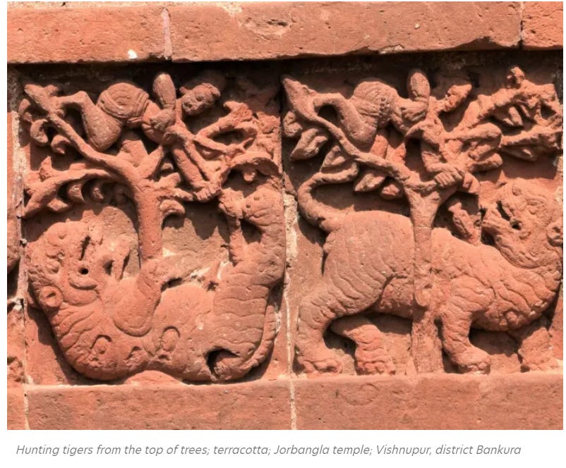 Hunting tigers from the top of trees; terracotta; Jorbangla temple in Bishnupur, Bankura district, West Bengal, India [Source: Tiger Hunting in the Decorations of Temples in West Bengal]