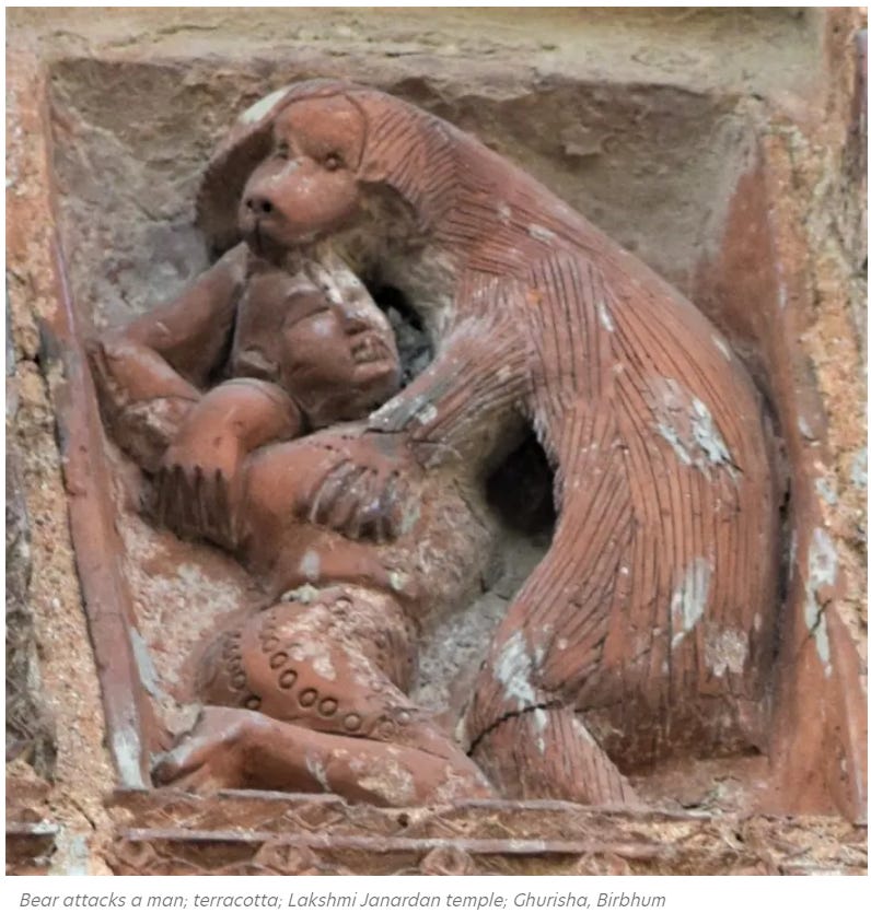 Bear attacks a man; terracotta; Lakshmi Janardan temple; Ghurisha, Birbhum district, West Bengal, India [Source: Hunters and Hunting in the Decorations of Temples of West Bengal]