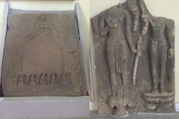 Left: sandstone Stūpa relief [Source: File:Stone bas-relief of stupa.jpg - Wikimedia Commons]