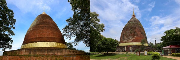 Conical zedis Payama Stūpa (Built 4th-7th century CE) and Payagi Stūpa (Built 5th-9th century CE) in Sri Ksetra, Hmawza, Myanmar — among the oldest structures of middle Pyu period [Source: Payama Stupa, Pyay, Myanmar AND Payagyi Stupa, Pyay (Prome), Myanmar]