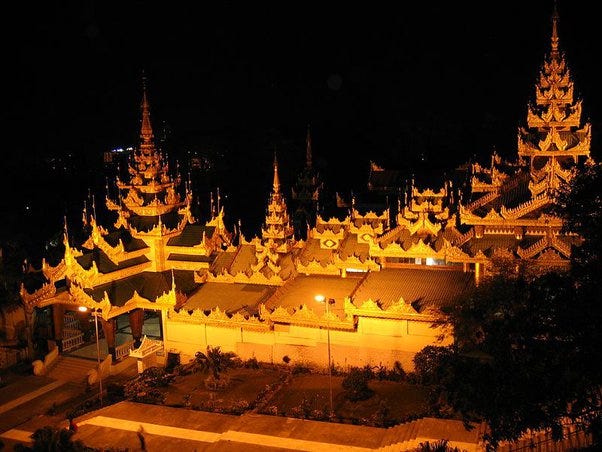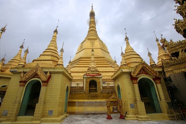 Subsidiary worship halls in Sule Pagoda Complex in Yangon, Myanmar — feature octagonal base stūpas arranged in cruciform pattern [Source: Sule Pagoda, Yangon, Myanmar]