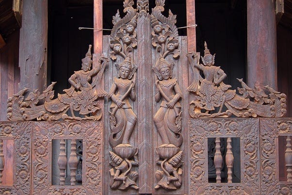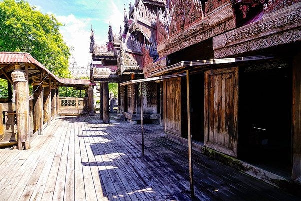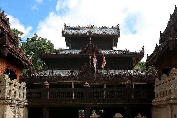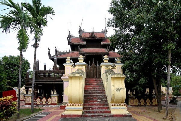 Yokesone Monastery of Salay, Magwe Region, Myanmar is known for its abundance of woodcarvings which depict scenes of the Jataka tales (most structures built in 1882 CE) [Source: File:Yokesone Monastery, Salay, built in 1882.jpg]