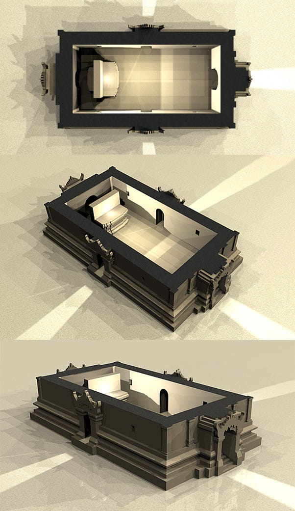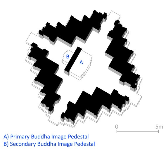Axonometric Cutaway of Guyogyo Temple of Bagan showing its 4 entrances and Buddha image pedestals [Source: Gu-yo-gyo-hpaya Temple, Bagan, Myanmar]