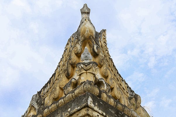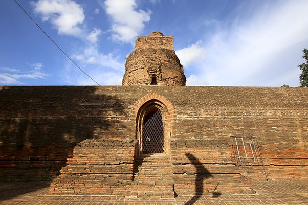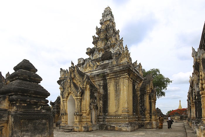 Htuk-Kan-Thein in Mrauk U, Mrauk U District, Rakhine State, Myanmar — built like a fort, the main stūpa is located towards the back of the temple. While the outer portion has multiple entrances reached via stairs, the inner portion itself has only one. (Built 1571 CE) [Source: File:HtukKanThein.jpg - Wikimedia Commons]