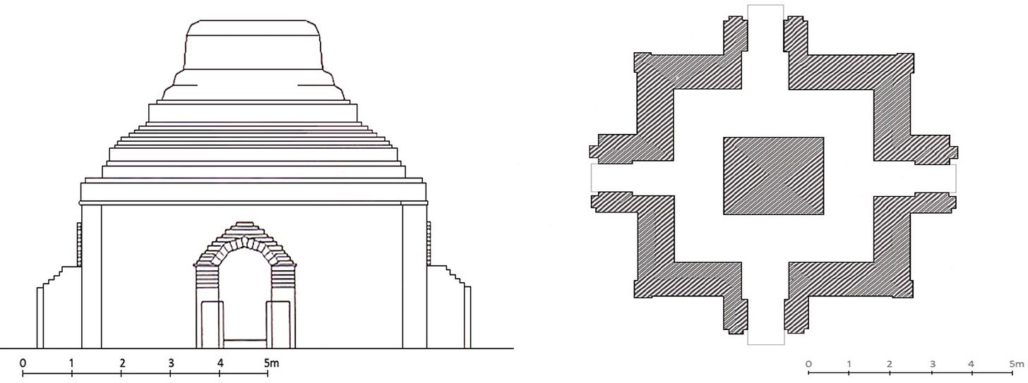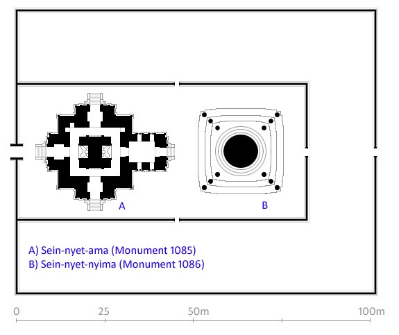 Symmetric floorplan of Sein-Nyet-Ama & Sein-Nyet-Nyima Temple Complex in Bagan, Myanmar — consists of an extended cruciform floorplan temple and a square floorplan stūpa [Source: Sein-Nyet-Ama & Nyima Temples, Bagan, Myanmar]
