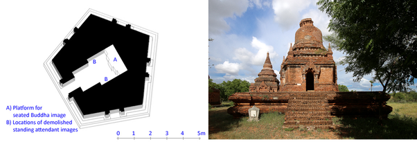 Pentagonal floorplan temples and temple complexes seem to have originated in Bagan Empire period: they are usually either individual pentagonal structures (eg. Dhammayazika Zedi) or groups of structures sharing a pentagonal base (eg. Monument 0566 in Bagan). Such structures are called nga-myet-hna (five-sided).
