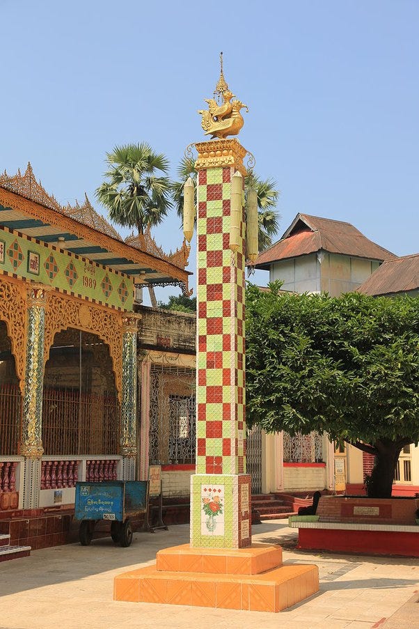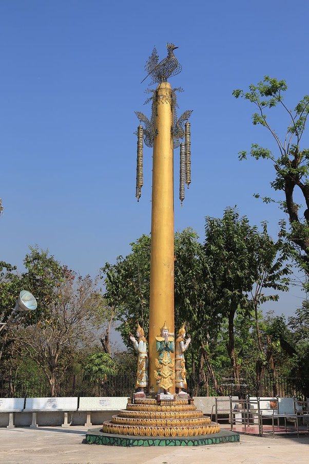 Tagundaing (တံခွန်တိုင်) — ornamented flagstaff celebrating the submission of local nats (animistic spirits) to the Dhamma