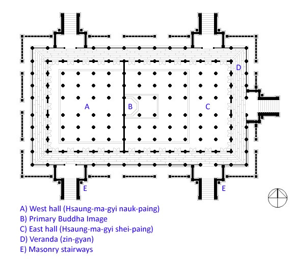 Floorplans of Myanmar style temples are usually rectangular, with entrances on either 1 or all 4 sides. In cases where a connected hall exists, there can be upto 6 entrances: 3 in the connected hall and 3 in the main temple structure itself.