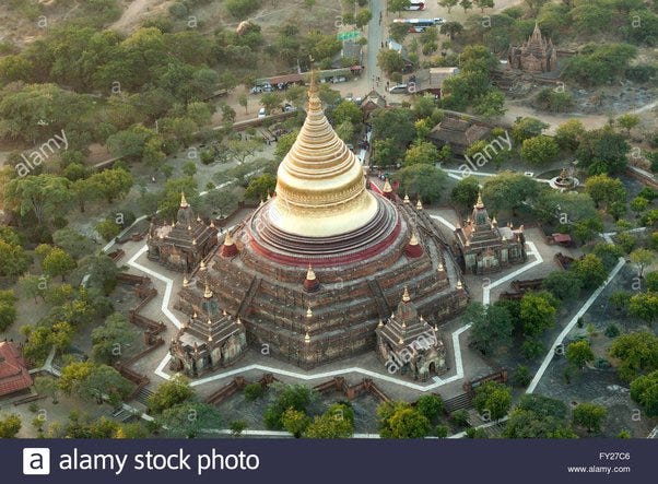 Dhammayazika Pagoda showing the pentagonal plan and the 5 entrances of the main pagoda [Source: Stock Photo - An aerial view of the pentagonal Paya Dhammayazika with its golden dome, in the surroundings of the New Bagan (Myanmar]