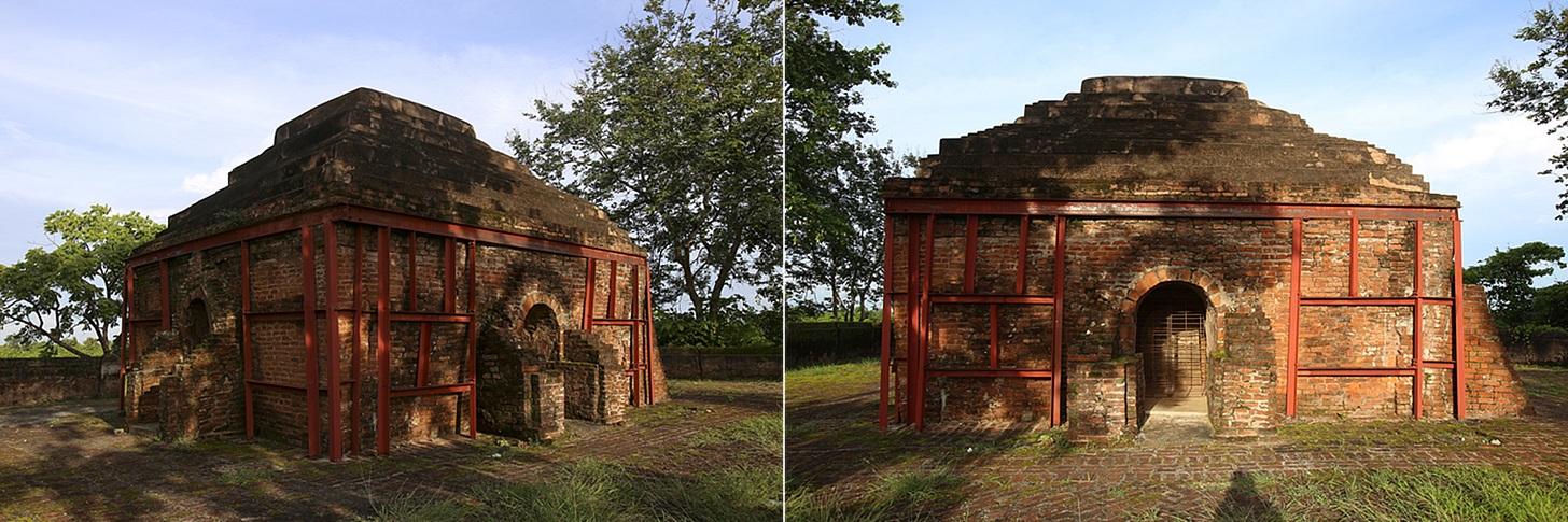 Htuk-Kan-Thein in Mrauk U, Mrauk U District, Rakhine State, Myanmar — an ordination hall (thein) built like a fort, the main pagoda is located towards the back of the temple. While the outer portion has multiple entrances reached via stairs, the inner portion itself has only one. (Built 1571 CE) [Source: File:HtukKanThein.jpg - Wikimedia Commons and File:Mrauk U, Dukkanthein (6211919307).jpg - Wikimedia Commons]