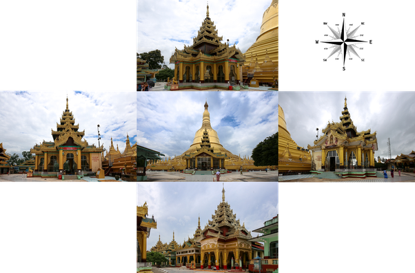 A temple complex can have a central temple or central zedi along with one or more subsidiary structures including smaller zedis, true stūpas, worship halls, subsidiary temples and pavilions. This structures can be surrounded by one or more enclosures, having gates usually in cardinal directions.