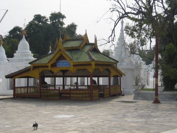 Aerial view of Kuthodaw Pagoda Complex & Sandar Muni Pagoda Complex in Mandalay, Mandalay district, Mandalay Region, Myanmar — both complexes are rectangular with 4 entrances and a large central zedi [Source: File:Ku Tho Taw Pagoda & Sandar Muni Pagoda, Mandalay.jpg]