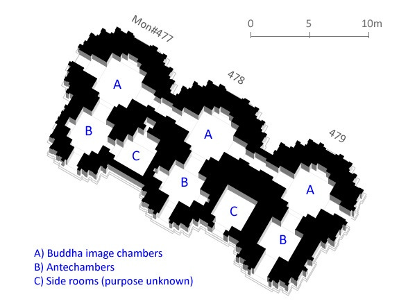 — hollow square or rectangular buildings built to resemble caves, with chambers that house images of Buddha\
