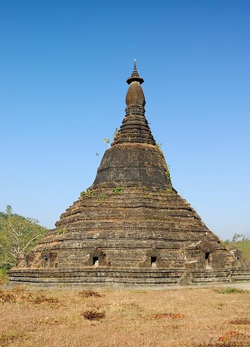 Mahabodhi Shwegu Temple in Mrauk U, Rakhine State, Myanmar — a single entrance temple with an octagonal bell shaped tower (Built late 15th century CE under king Ba Saw Phyu) [Source: Mahabodhi Shwegu temple]