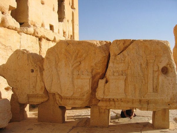 Relief at the courtyard of the temple showing detailed ornaments and depictions of Palmyrene war deities [Source: https://upload.wikimedia.org/wikipedia/commons/thumb/5/59/PALMYRA_Tempio_di_Baal_particolare_del_fregio_con_sfilata_degli_dei_-_GAR_-_6-057.jpg/1920px-PALMYRA_Tempio_di_Baal_particolare_del_fregio_con_sfilata_degli_dei_-_GAR_-_6-057.jpg]
